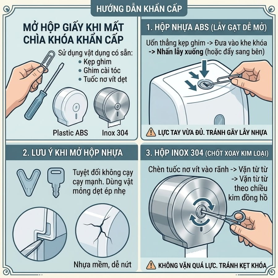 Trong tình huống khẩn cấp, khi bạn cần thay giấy ngay lập tức để phục vụ khách hàng nhưng lại không tìm thấy chìa khóa hộp đựng giấy, các vật dụng có sẵn như kẹp ghim giấy, ghim cài tóc hoặc một chiếc tuốc nơ vít dẹt nhỏ (mũi dẹt) sẽ là vị cứu tinh của bạn. Hầu hết các cơ chế khóa của hộp giấy cuộn lớn làm bằng nhựa ABS hiện nay đều sử dụng lẫy gạt đơn giản chứ không phải hệ thống bi khóa phức tạp như cửa nhà.