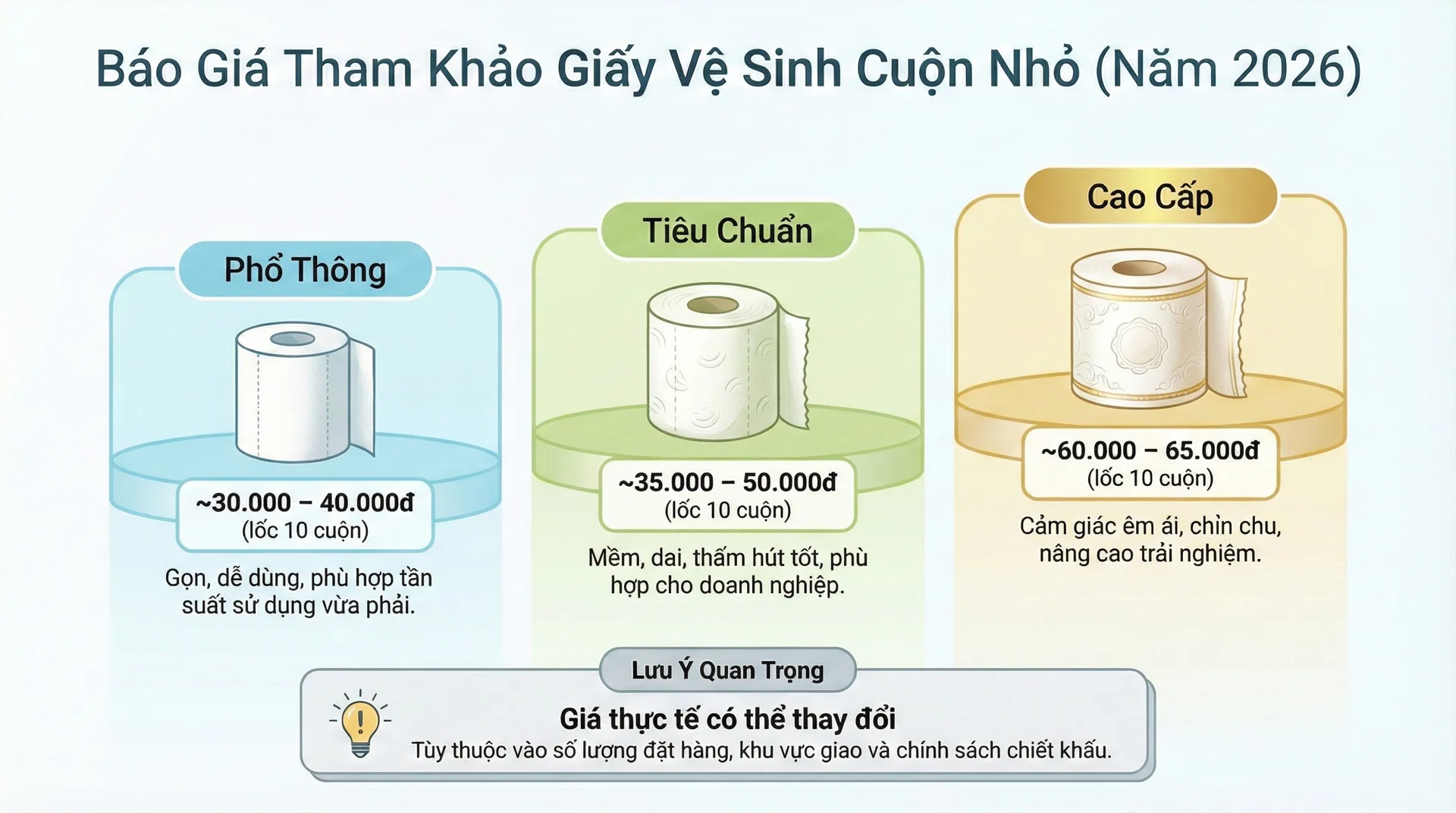 | Tiêu chuẩn | Nhóm cuộn nhỏ doanh nghiệp | Mềm–dai–thấm ổn, dễ tương thích hộp | ~35.000–50.000đ |