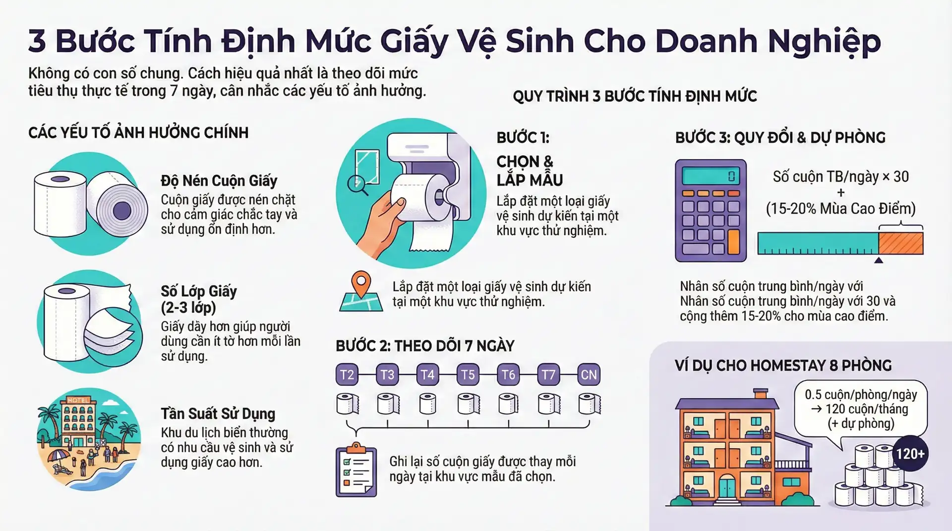 - Homestay 8 phòng: trung bình 0,5 cuộn/phòng/ngày → 0,5 × 30 × 8 = 120 cuộn/tháng (+ dự phòng).