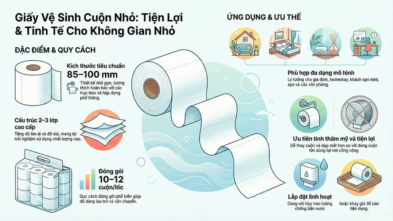 Khác với giấy cuộn lớn (jumbo roll) thường dùng cho khu vực công cộng lưu lượng cao, cuộn nhỏ ưu tiên tiện lợi khi sử dụng, dễ thay cuộn, và tăng tính thẩm mỹ cho không gian vệ sinh nhỏ.