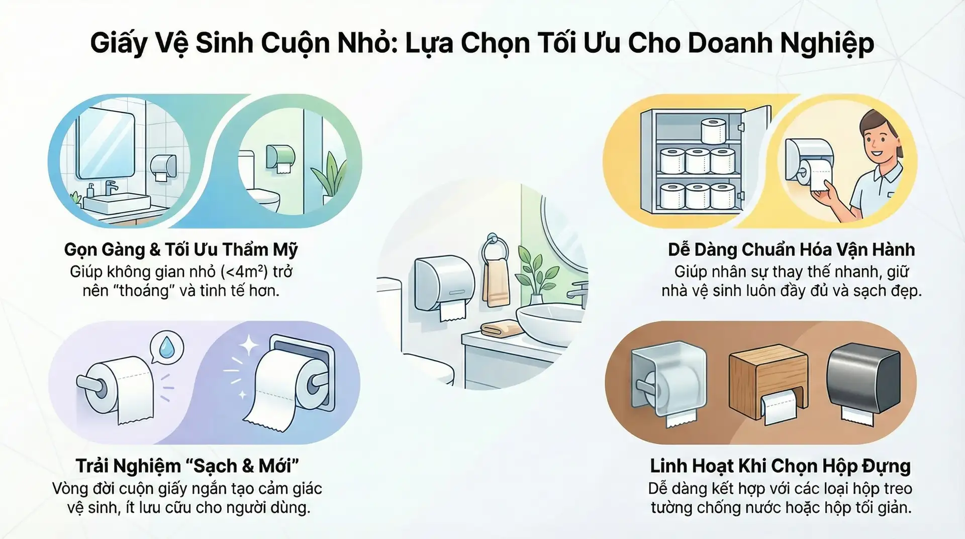 Giấy vệ sinh cuộn nhỏ phù hợp nhất với các mô hình cần tiện lợi – gọn gàng – trải nghiệm cao cấp, đặc biệt khi nhà vệ sinh diện tích hạn chế và ưu tiên hộp đựng thẩm mỹ. Lỗi thường gặp là “chọn sai hệ cuộn cho sai mô hình”: cuộn lớn cồng kềnh trong không gian nhỏ, hoặc cuộn nhỏ ở nơi lưu lượng quá cao khiến phải thay nhiều lần.