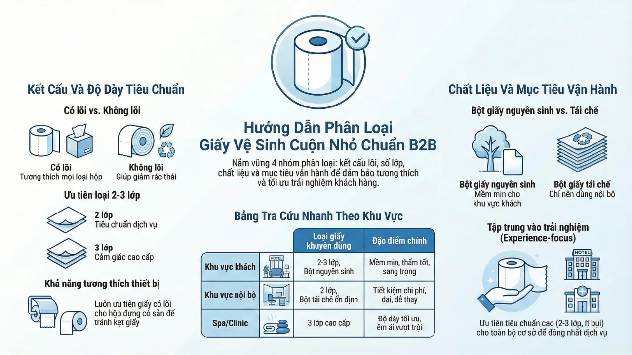 3. Giấy vệ sinh cuộn nhỏ có mấy loại? (Hướng dẫn phân loại chuẩn B2B)