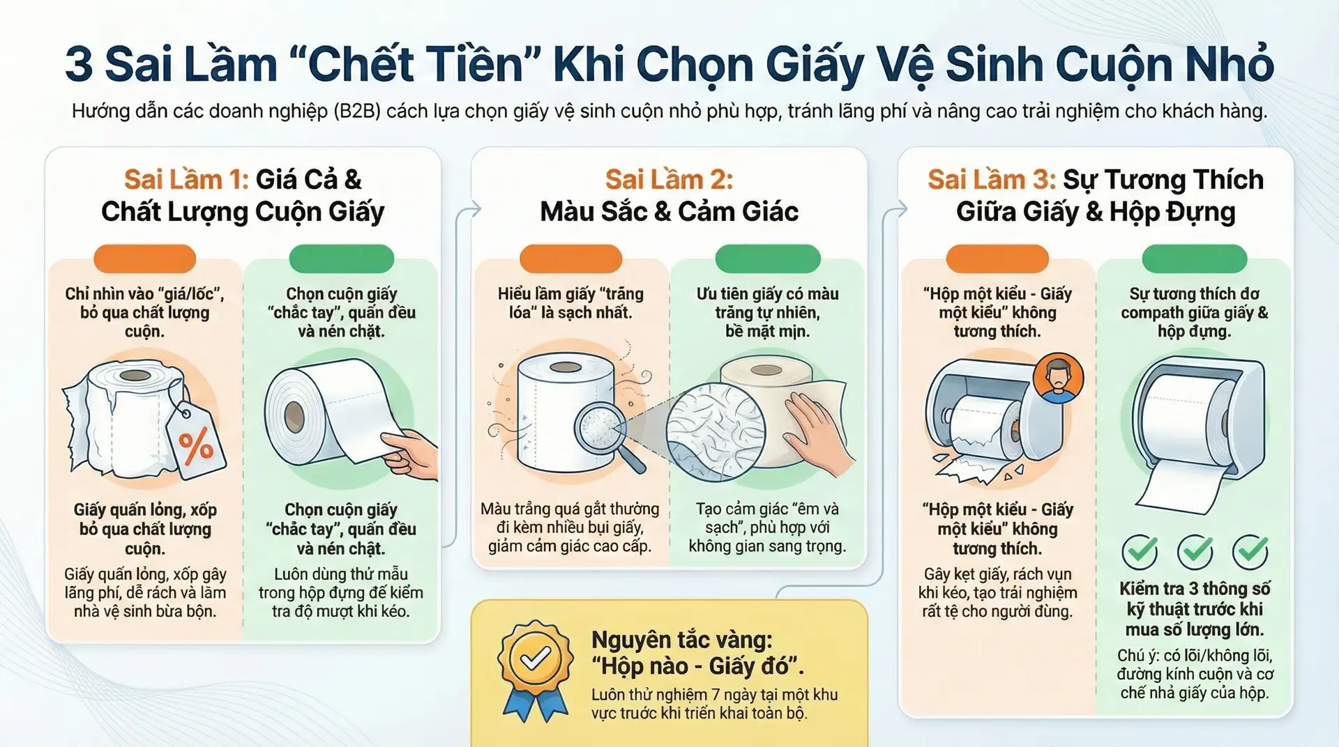 3 sai lầm dễ khiến trải nghiệm nhà vệ sinh “tụt hạng” là: chỉ nhìn giá, chọn giấy trắng lóa, và mua giấy không khớp hộp đựng. Chỉ cần kiểm tra đúng 3 điểm dưới đây, bạn sẽ tránh hầu hết sự cố kẹt giấy, rách vụn và cảm giác dùng kém cao cấp.
