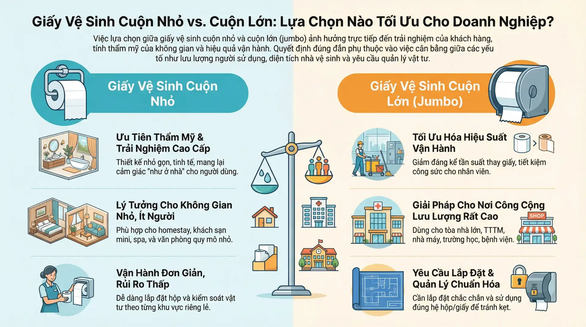 Chọn cuộn nhỏ nếu bạn ưu tiên tiện lợi, thẩm mỹ và trải nghiệm cao cấp trong không gian vệ sinh nhỏ (homestay, khách sạn mini, spa, văn phòng nhỏ). Chọn cuộn lớn (jumbo) nếu điểm dùng có lưu lượng rất cao và cần giảm tần suất thay cuộn (tòa nhà lớn, khu công cộng).