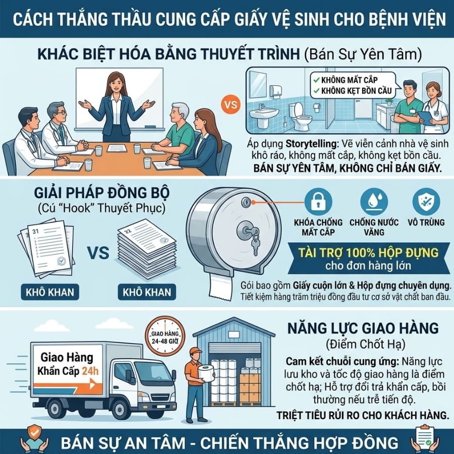 Sở hữu hồ sơ pháp lý đẹp mới chỉ là điều kiện cần. Điều kiện đủ để bạn đánh bại 4-5 đối thủ sừng sỏ khác trên bàn đàm phán chính là sự “khác biệt hóa” trong giải pháp. Các cán bộ mua sắm của bệnh viện rất mệt mỏi với việc chỉ nhìn vào các con số báo giá khô khan. Bạn cần áp dụng kỹ năng kể chuyện (storytelling) trong bản thuyết trình: vẽ ra viễn cảnh nhà vệ sinh bệnh viện luôn khô ráo, không bao giờ mất cắp giấy, không bao giờ kẹt bồn cầu. Bạn phải bán sự yên tâm, chứ không chỉ bán giấy.
