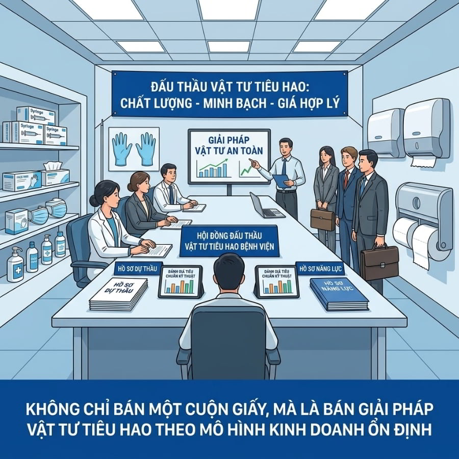 Đấu thầu vật tư tiêu hao bệnh viện là một quy trình mua sắm công, trong đó các cơ sở y tế (nhà nước hoặc tư nhân quy mô lớn) mời gọi các nhà cung cấp cạnh tranh công khai để chọn ra đơn vị cung cấp các sản phẩm tiêu hao với chất lượng tốt nhất, giá cả hợp lý nhất và pháp lý minh bạch nhất. Khác với máy móc thiết bị y tế dùng lâu dài, vật tư tiêu hao là những sản phẩm chỉ sử dụng một lần hoặc hao mòn nhanh chóng theo thời gian như: bơm kim tiêm, găng tay y tế, hóa chất sát khuẩn, và đặc biệt là hệ thống giấy vệ sinh, khăn giấy lau tay cho toàn bộ khu vực phòng khám, khu lưu trú bệnh nhân.
