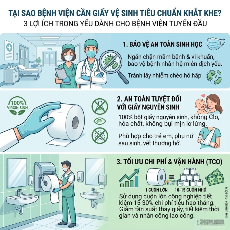 Môi trường y tế là nơi tập trung rất nhiều mầm bệnh và cũng là nơi có những bệnh nhân mang hệ miễn dịch suy yếu nhất. Bất kỳ một vật dụng nào tiếp xúc với con người tại đây, kể cả giấy vệ sinh, đều phải tuân thủ nghiêm ngặt các quy chuẩn về an toàn sinh học. Bạn không thể cung cấp loại giấy tái chế đầy bụi mịn và hóa chất tẩy trắng cho một môi trường yêu cầu sự vô trùng. Bệnh viện yêu cầu sự khắt khe không phải để làm khó nhà thầu, mà để bảo vệ sinh mạng người bệnh và tối ưu hóa hệ thống vận hành tòa nhà.