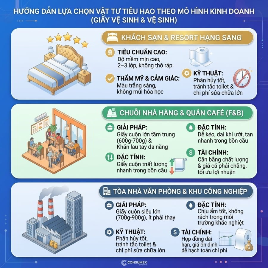 Trong ngành dịch vụ lưu trú cao cấp, mọi chi tiết nhỏ nhất đều là một “điểm chạm” thương hiệu. Trải nghiệm của khách hàng tại từng chi tiết nhỏ nhất – kể cả giấy vệ sinh – cũng góp phần tạo nên ấn tượng chuyên nghiệp. Đối với mô hình này, việc áp dụng giải pháp vật tư tiêu hao theo mô hình kinh doanh không chỉ dừng lại ở tính năng tiết kiệm.