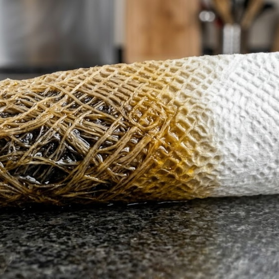 Hoàn toàn không. Nhờ công nghệ xử lý độ bền ướt (Wet strength) và chất liệu 100% bột nguyên sinh, giấy lau bếp đa năng duy trì độ dai dẻo kinh ngạc ngay cả khi ngâm trong nước hay ngập trong vũng dầu mỡ. Bạn có thể tự tin chà xát mạnh tay trên bề mặt bếp mà không lo để lại các vụn mủn giấy khó chịu.