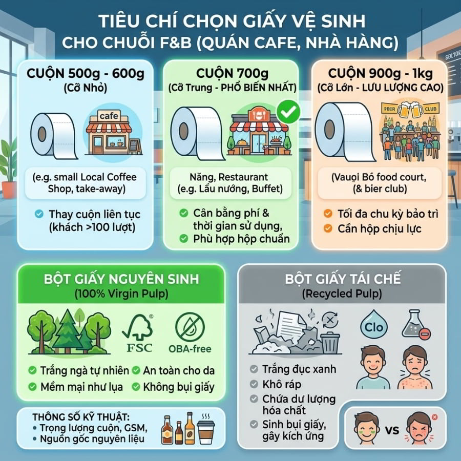 Hãy coi việc chọn giấy vệ sinh như việc bạn chọn mua nguyên liệu pha chế cho quầy bar. Nó cần sự nhất quán, chất lượng và phù hợp với đúng đối tượng phục vụ. Dưới đây là những tiêu chuẩn cốt lõi mà mọi quản lý chuỗi F&B cần nằm lòng trước khi đặt bút ký hợp đồng cung ứng vật tư.