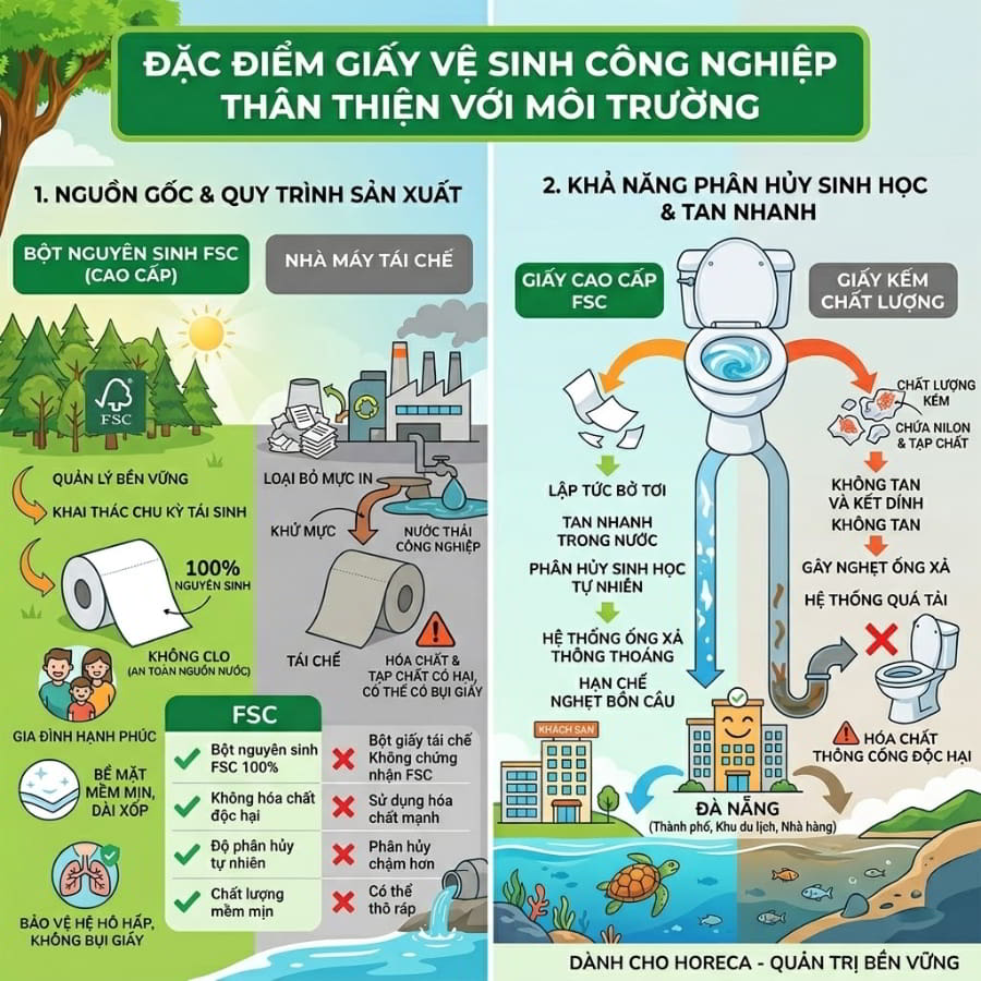 Chuyển đổi sang giấy vệ sinh công nghiệp là một bước đi mang tính chiến lược. Mỗi cuộn giấy lớn được thiết kế để thay thế cho hàng chục cuộn nhỏ lẻ. Điều này trực tiếp cắt giảm đáng kể lượng rác thải bao bì, lõi giấy thải ra môi trường. Hơn thế nữa, các dòng giấy công nghiệp cao cấp hiện nay đều đạt chứng nhận chuẩn quốc tế về rừng bền vững (FSC). Bằng cách áp dụng những danh mục sản phẩm giấy công nghiệp chuẩn mực, các doanh nghiệp tại Đà Nẵng đang góp phần giảm thiểu dấu chân carbon (carbon footprint), bảo vệ tài nguyên thiên nhiên và giữ gìn hệ thống thoát nước không bị quá tải bởi các loại giấy kém chất lượng khó phân hủy.