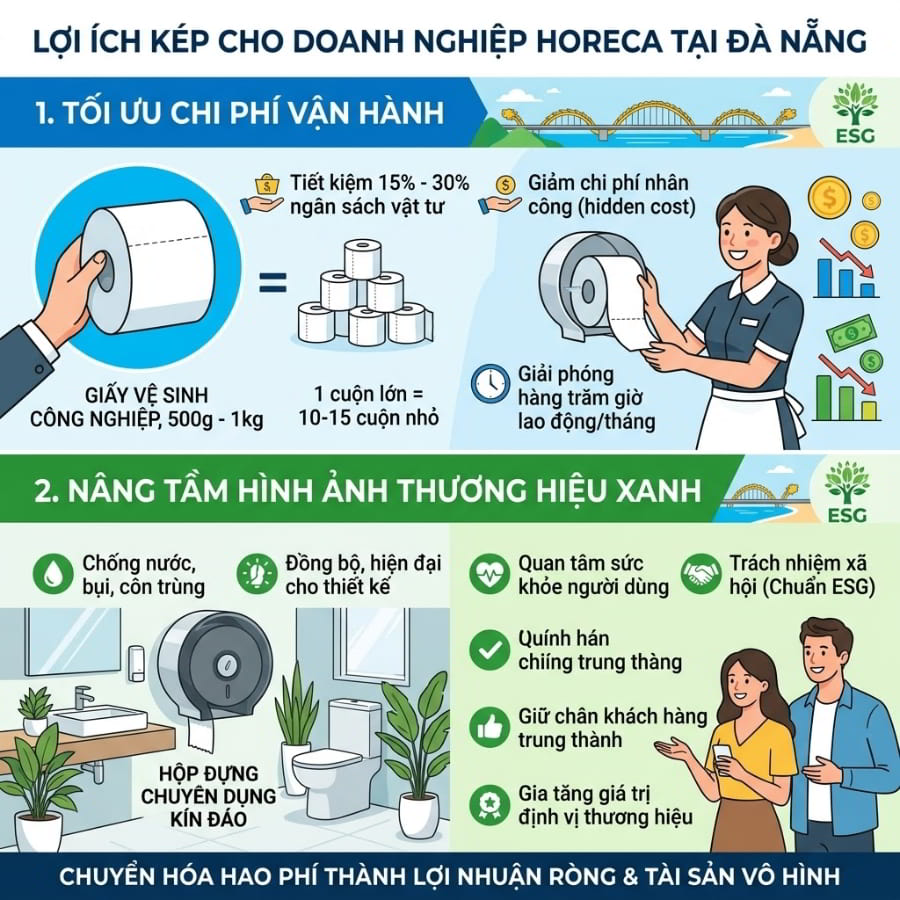 Đà Nẵng đang vươn mình trở thành đô thị sinh thái hàng đầu khu vực. Giữa làn sóng chuyển dịch sang mô hình kinh doanh xanh, hàng ngàn nhà hàng, khách sạn và khu nghỉ dưỡng đang đối mặt với một “nỗi đau” thầm lặng: Lượng rác thải khổng lồ từ bao bì nhựa và lõi giấy vệ sinh cuộn nhỏ mỗi ngày. Việc liên tục thay giấy không chỉ bào mòn chi phí vận hành mà còn đi ngược lại tiêu chuẩn ESG (Môi trường – Xã hội – Quản trị). Lúc này, giải pháp giấy vệ sinh công nghiệp bảo vệ môi trường Đà Nẵng nổi lên như một cứu cánh. Đây không đơn thuần là vật tư tiêu hao, mà là một lời cam kết bền vững. Bài viết này sẽ phân tích sâu sắc lý do tại sao giấy vệ sinh công nghiệp lại là “chìa khóa vàng” giúp doanh nghiệp HORECA tại Đà Nẵng vừa tối ưu ngân sách, vừa bảo vệ hệ sinh thái biển tuyệt đẹp.