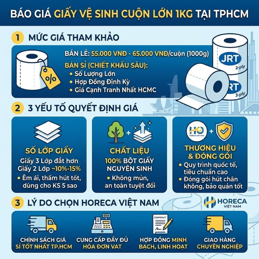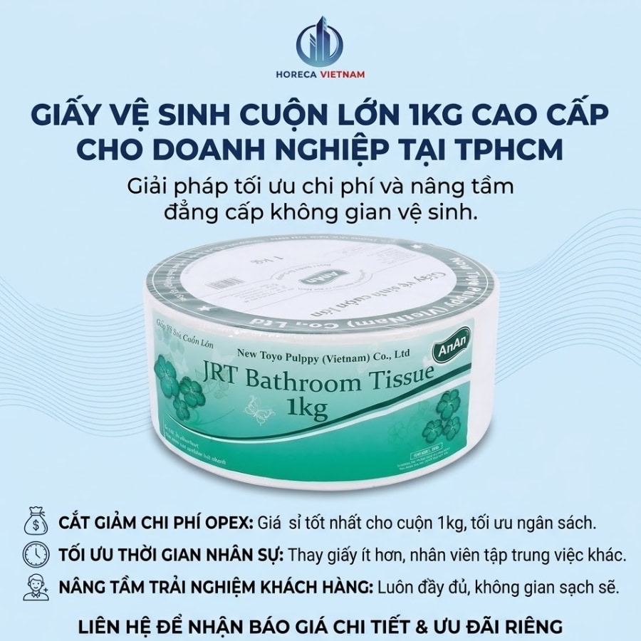 Đó là lúc giấy vệ sinh cuộn lớn 1KG TPHCM (chuẩn 1kg) bước vào và thay đổi hoàn toàn cục diện. Hãy cùng Horeca Việt Nam khám phá báo giá chi tiết và những giá trị ẩn sâu đằng sau cuộn giấy khổng lồ này, giúp doanh nghiệp của bạn nâng tầm đẳng cấp không gian vệ sinh.