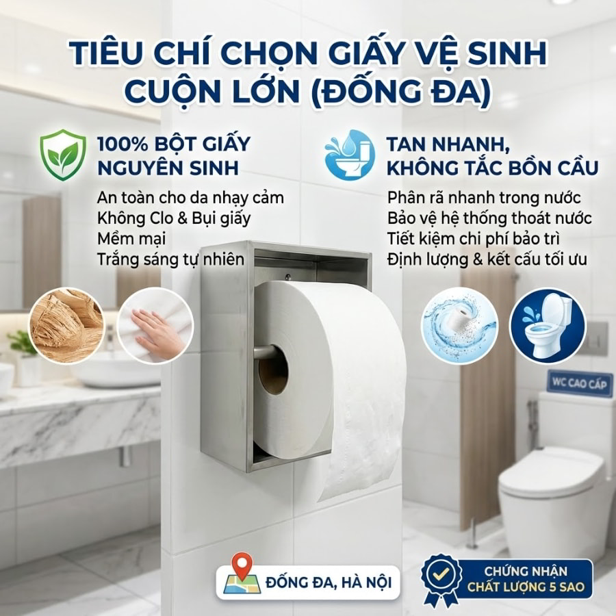Một sai lầm phổ biến là sử dụng các loại giấy dai cứng chứa quá nhiều sợi nilon nhân tạo. Ngược lại, giấy vệ sinh cuộn lớn chuẩn công nghiệp có khả năng tan trong nước nhanh, nhưng nếu sử dụng sai cách vẫn có thể gây nghẹt toilet hoặc lãng phí. Các sản phẩm giấy Jumbo cao cấp được nghiên cứu kỹ lưỡng về định lượng và kết cấu sợi giấy, đảm bảo chúng sẽ phân rã thành các mảnh nhỏ một cách tự nhiên khi xối nước mạnh. Để tăng thêm sự an tâm cho hệ thống thoát nước của tòa nhà tại Đống Đa, bạn nên ưu tiên những nhà phân phối chuyên nghiệp, có chứng nhận kiểm định rõ ràng. Tham khảo thêm về các dòng giấy vệ sinh cuộn lớn cho tòa nhà để đưa ra lựa chọn sáng suốt nhất.