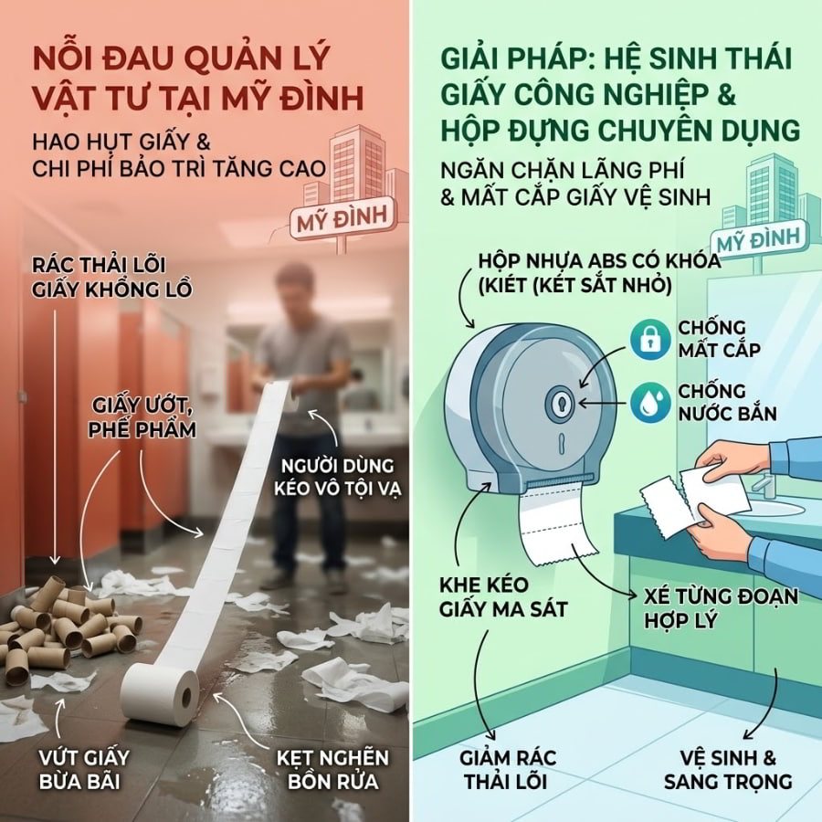Khu vực Nam Từ Liêm và Mỹ Đình đang vươn mình trở thành cực tăng trưởng mới của thủ đô, quy tụ hàng loạt các tòa nhà văn phòng hạng A, trung tâm thương mại và chung cư cao cấp. Đằng sau sự hào nhoáng của những mặt kính chọc trời ấy là một cuộc chiến tối ưu dòng tiền vô hình mà mỗi Trưởng ban Quản lý tòa nhà (Facility Manager) đều phải đối mặt mỗi ngày. Bạn có đang đau đầu khi chi phí vật tư nhà vệ sinh liên tục “thủng đáy”? Nhân viên tạp vụ phàn nàn vì phải chạy đi châm giấy mỗi giờ? Đã đến lúc gạt bỏ những cuộn giấy nhỏ lẻ truyền thống để bước vào kỷ nguyên tối ưu hóa. Cùng khám phá giải pháp “cứu cánh” ngân sách mang tên giấy vệ sinh cuộn lớn Nam Từ Liêm – quân bài chiến lược đang định hình lại tiêu chuẩn vận hành cơ sở vật chất hiện đại!