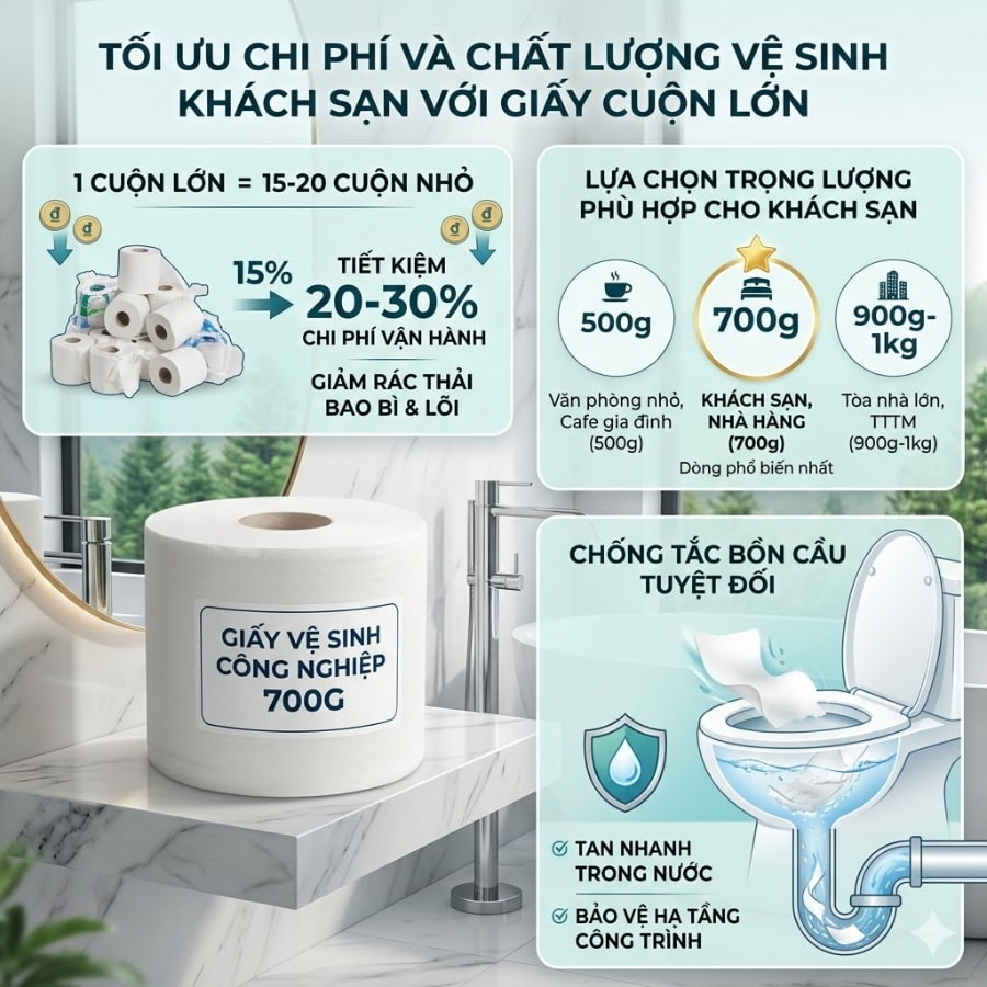 Lựa chọn đúng trọng lượng giấy là chìa khóa để tối ưu chi phí. Đối với các văn phòng nhỏ hoặc quán cafe quy mô gia đình tại Phường 2, cuộn 500g là lựa chọn phù hợp nhất, với mức giá dao động khoảng 20.000 – 30.000 VNĐ/cuộn. Tuy nhiên, đối với các khách sạn, nhà hàng, hoặc trung tâm thương mại có lượng khách ra vào liên tục, các chuyên gia quản trị khuyên dùng cuộn 700g. Dòng cuộn 700g là dòng phổ biến nhất hiện nay, cung cấp sự cân bằng hoàn hảo giữa độ dài giấy và chi phí đầu tư. Nếu cơ sở của bạn là một tòa nhà phức hợp lớn, bạn có thể tham khảo chuyên sâu hơn về các dòng giấy vệ sinh cuộn lớn cho tòa nhà với trọng lượng lên đến 900g hoặc 1kg để giảm tối đa số lần bảo trì.