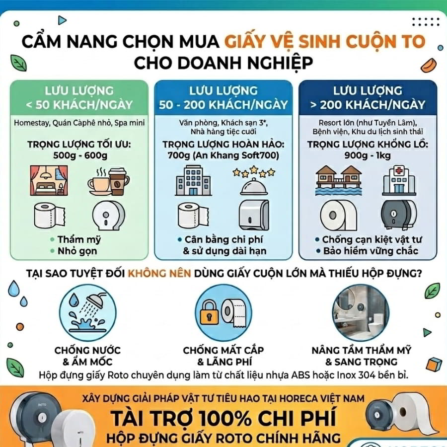 - Tôi kinh doanh homestay nhỏ (chỉ 5 phòng), có nên lắp giấy cuộn lớn không? Có thể dùng, nhưng bạn nên chọn dòng cuộn 500g (như An Khang Caro500). Dòng này vừa giúp tối ưu hóa nhân sự dọn phòng, tiết kiệm chi phí, lại có hộp đựng thiết kế rất nhỏ gọn, không làm mất thẩm mỹ không gian.