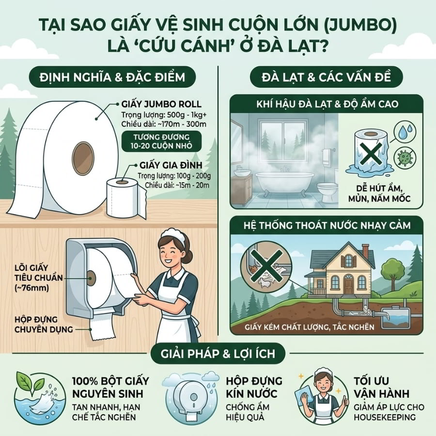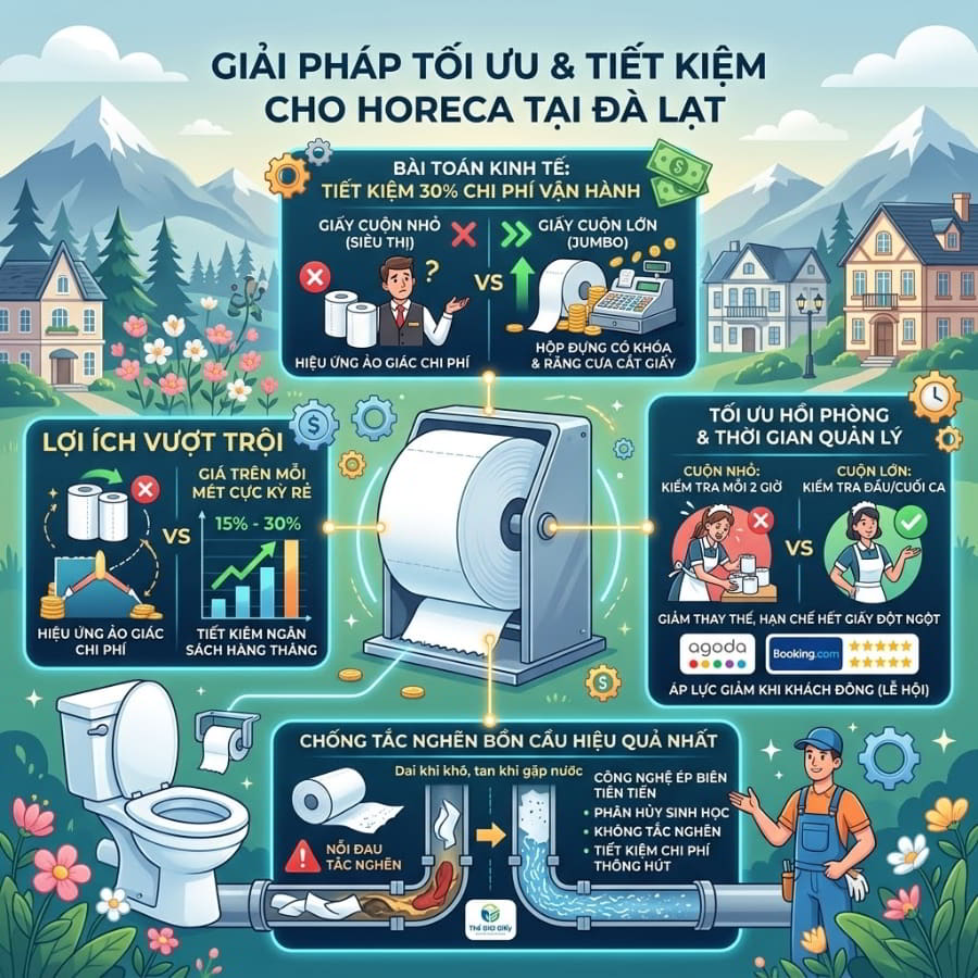 Đà Lạt – thành phố sương mù với sức hút mãnh liệt, luôn là điểm đến hàng đầu của hàng triệu du khách mỗi năm. Tuy nhiên, đằng sau sự hào nhoáng của những mùa lễ hội rực rỡ, các chủ doanh nghiệp lưu trú và dịch vụ ăn uống (HORECA) tại đây lại đang phải đối mặt với những “nỗi đau” thầm kín trong khâu vận hành. Bạn đã bao giờ phải nghe những lời phàn nàn từ khách hàng về tình trạng hết giấy vệ sinh giữa chừng? Hay nhân viên buồng phòng của bạn phải chạy đôn chạy đáo thay từng cuộn giấy nhỏ lẻ trong những ngày lễ Tết cao điểm? Và tồi tệ nhất, là viễn cảnh phải chi trả hàng triệu đồng để thông tắc bồn cầu vì sử dụng phải loại giấy vệ sinh giá rẻ, khó phân hủy trong hệ thống ống nước nhạy cảm tại các sườn đồi Đà Lạt?