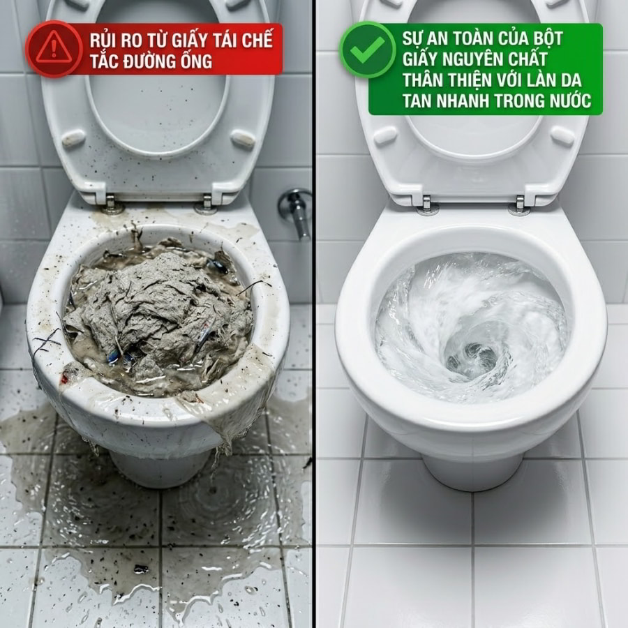 Nguy hiểm hơn, giấy tái chế giá rẻ thường có cấu trúc sợi giấy rất thô và dai một cách bất thường nhờ pha trộn nilon hoặc phụ gia. Chúng không có khả năng phân tách tự nhiên khi gặp nước. Khi khách hàng xả nước, các mảng giấy này sẽ cuộn lại thành những cục cứng ngắc, mắc kẹt tại các khúc cua của đường ống. Hậu quả là bồn cầu bị tắc nghẽn nghiêm trọng, bốc mùi hôi thối, doanh nghiệp phải chi trả hàng triệu đồng cho dịch vụ thông cống và hứng chịu hàng loạt phàn nàn từ khách hàng. Để tránh viễn cảnh tồi tệ này, việc lựa chọn giấy cuộn lớn làm từ bột nguyên sinh dễ dàng phân hủy trong nước chính là giải pháp bảo vệ tài sản thông minh nhất.