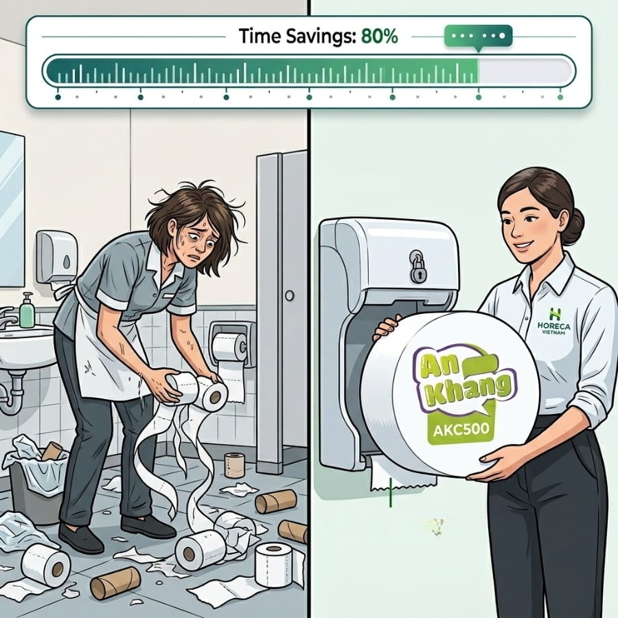 Hãy thử tưởng tượng cảnh tượng này: Bạn đang quản lý một nhà hàng sang trọng đang trong giờ cao điểm cuối tuần tại trung tâm Thành phố Thủ Đức. Đột nhiên, khách hàng phàn nàn vì nhà vệ sinh hết giấy. Nhân viên phục vụ của bạn phải bỏ dở việc bưng bê thức ăn để chạy đi tìm những cuộn giấy vệ sinh nhỏ bé, bóc từng lớp nilon một cách vội vã. Chưa kể, những cuộn giấy nhỏ thường xuyên bị rơi ướt nhem nhuốc dưới sàn, hoặc không cánh mà bay vì những vị khách có “tính tắt mắt”. Đây không phải là một câu chuyện hư cấu, mà là “nỗi đau” dai dẳng đang bào mòn doanh thu và trải nghiệm khách hàng của hàng trăm doanh nghiệp, quán cafe, tòa nhà văn phòng hiện nay.
