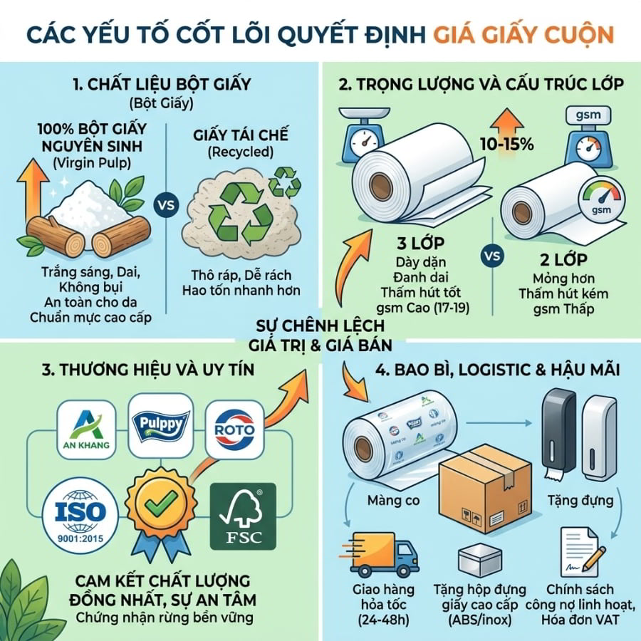 Yếu tố thứ ba là sức mạnh và uy tín của thương hiệu. Những thương hiệu đã có bề dày lịch sử và uy tín vững chắc trên thị trường vật tư Horeca như An Khang, Roto hay Pulppy thường định vị mức giá nhỉnh hơn đôi chút. Sự chênh lệch này là chi phí bạn trả cho sự an tâm. Họ cam kết mang đến một quy trình sản xuất khép kín đạt tiêu chuẩn quốc tế ISO 9001:2015 , chứng nhận rừng bền vững FSC, đảm bảo chất lượng hàng ngàn cuộn như một, không có tình trạng mốc, ẩm hay xén bớt định lượng.