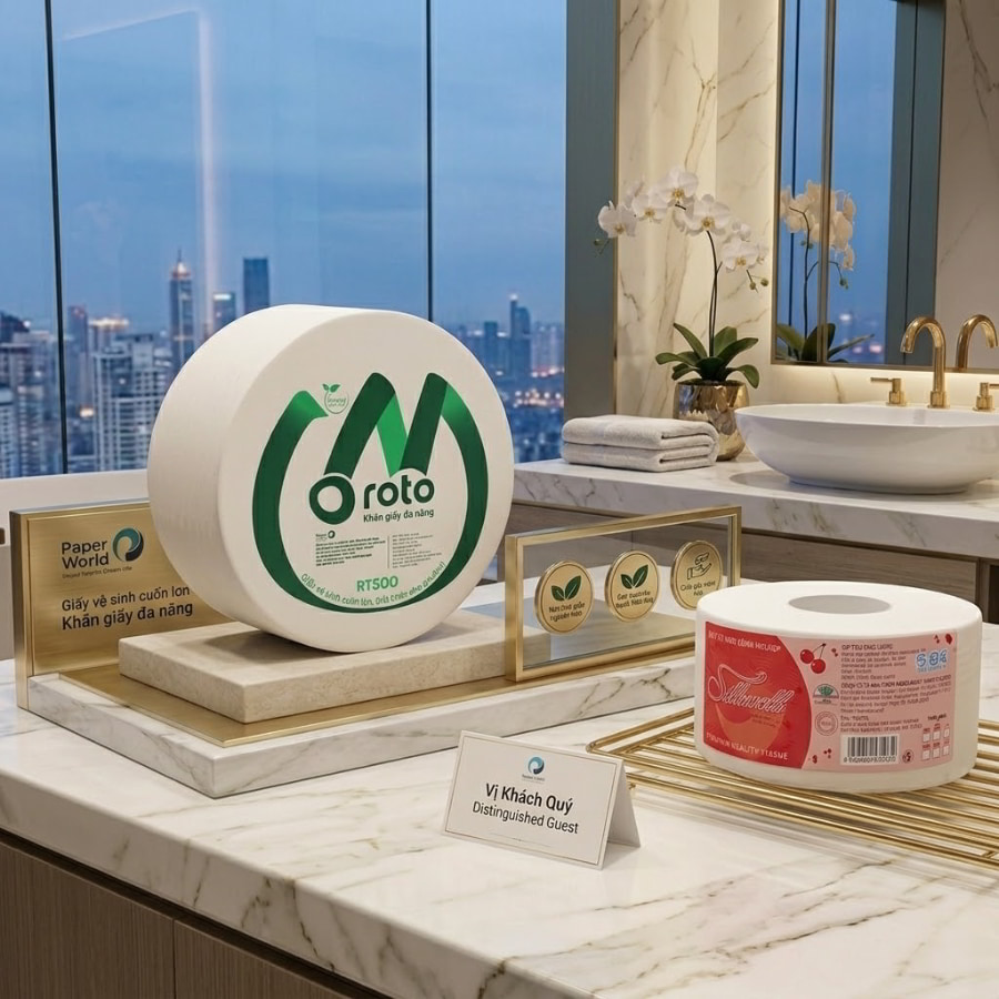 Bên cạnh xúc giác, thị giác và khứu giác cũng bị đòi hỏi khắt khe: giấy phải có màu trắng sáng tự nhiên thanh tao (không phải trắng bóc do lạm dụng chất tẩy huỳnh quang), tuyệt đối vắng bóng những mùi hương hóa học nồng nặc, rẻ tiền. Một yếu tố mang tính sống còn về mặt kỹ thuật hạ tầng là giấy phải có khả năng tự phân hủy sinh học xuất sắc, hòa tan nhanh chóng trong nước để đảm bảo hệ thống đường ống toilet phức tạp, chằng chịt của khách sạn nhiều tầng không bao giờ gặp sự cố tắc nghẽn đáng xấu hổ, gây mùi hôi thối. Cuối cùng, để tôn lên vẻ đẹp kiến trúc, những cuộn giấy cao cấp này phải được đặt trang trọng bên trong những chiếc hộp đựng âm tường bằng inox xước, hoặc hộp nhựa ABS cao cấp có thiết kế thẩm mỹ tinh tế, tạo nên một tổng thể không gian nhà vệ sinh hoàn mỹ.