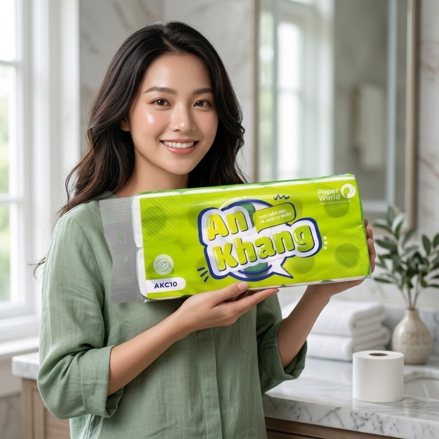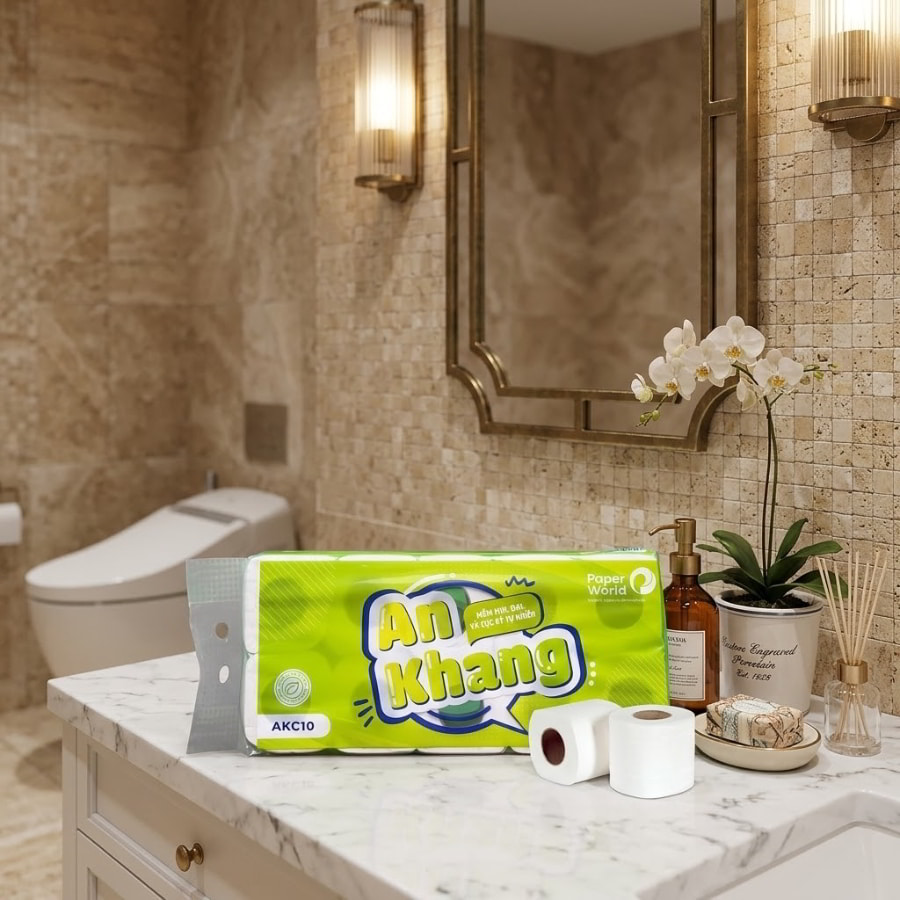 Giấy vệ sinh cuộn nhỏ cao cấp giải quyết triệt để bài toán này nhờ đặc tính vật lý ưu việt. Do được dệt từ sợi nguyên sinh tinh khiết, giấy giữ được độ dai khi dùng khô nhưng lại phá vỡ liên kết cực nhanh khi xả nước. Nhờ vậy, giấy tan nhanh trong nước – không gây tắc nghẽn, thân thiện môi trường. Các dòng cao cấp như An Khang, Japani Premium được thiết kế với tiêu chí tan nhanh trong nước, giúp hệ thống tự hoại hoạt động trơn tru. Điều này biến cuộn giấy vệ sinh từ một khoản “chi phí tiêu hao” trở thành một “khoản đầu tư bảo hiểm” cho cơ sở hạ tầng của doanh nghiệp.