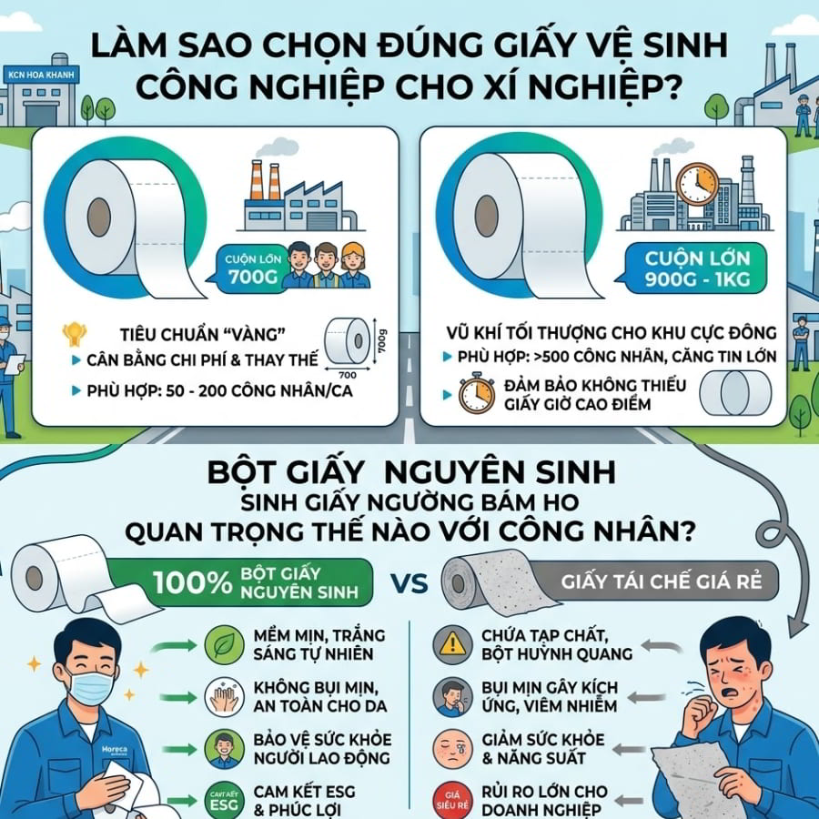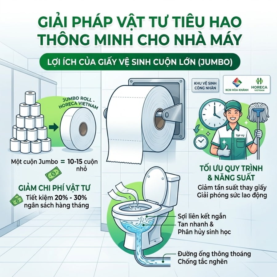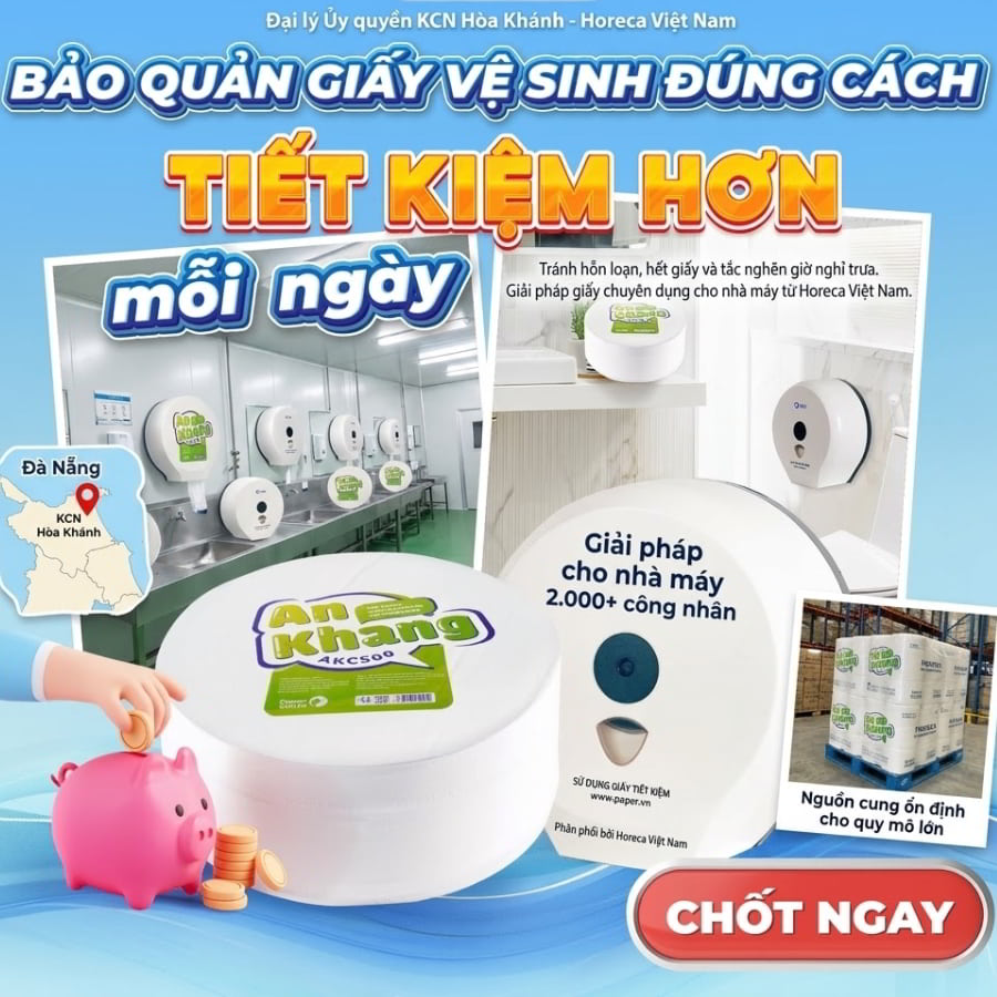 Hãy tưởng tượng một kịch bản tồi tệ tại khu nhà xưởng: Giờ nghỉ trưa của hơn 2.000 công nhân vừa bắt đầu, nhưng các phòng vệ sinh lại rơi vào tình trạng “đinh tai nhức óc” vì hai lý do: hết sạch giấy vệ sinh và bồn cầu bị tắc nghẽn nghiêm trọng, nước tràn lênh láng. Đội ngũ tạp vụ chạy đôn chạy đáo, trong khi bộ phận Nhân sự liên tục nhận phàn nàn. Sự cố này không chỉ làm gián đoạn giờ nghỉ ngơi mà còn ảnh hưởng trực tiếp đến năng suất ca chiều của toàn nhà máy. Nếu bạn là Trưởng phòng Hành chính hay Thu mua tại Khu công nghiệp (KCN) Hòa Khánh, chắc chắn bạn không muốn điều này xảy ra. Giải pháp tận gốc cho bài toán đau đầu này chính là chuyển đổi sang sử dụng giấy vệ sinh khu công nghiệp Hòa Khánh chuyên dụng. Hãy cùng khám phá giải pháp vật tư tiêu hao tối ưu từ Horeca Việt Nam!