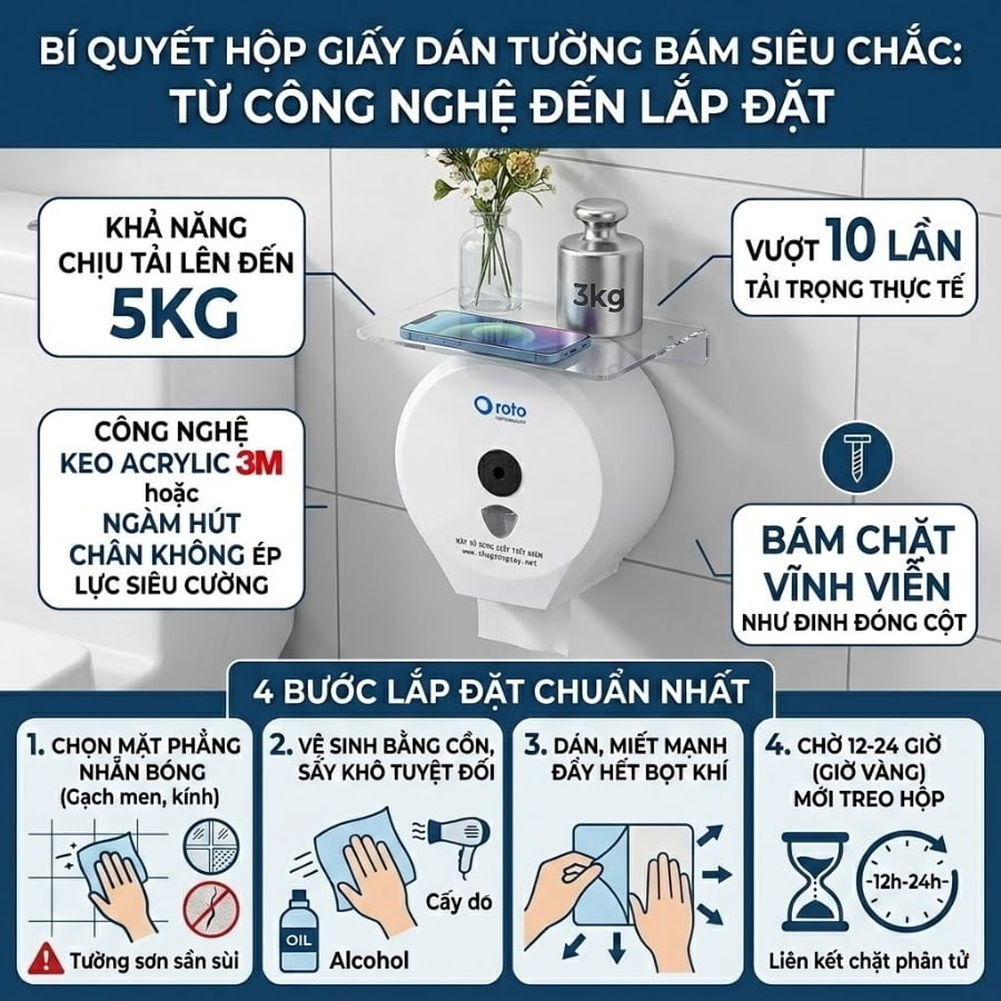 Tâm lý e ngại miếng dán tường bị bong tróc sau vài tuần sử dụng là rào cản lớn nhất khiến nhiều người ngần ngại. Nỗi sợ này xuất phát từ những miếng băng keo xốp rẻ tiền trong quá khứ. Công nghệ keo dán công nghiệp hiện nay đã có bước tiến dài kinh ngạc. Các sản phẩm hộp đựng giấy thiết bị vệ sinh cao cấp hiện nay đều sử dụng công nghệ keo dán acrylic 3M hoặc ngàm hút chân không ép lực siêu cường. Các lớp keo này hoạt động dựa trên cơ chế liên kết phân tử trực tiếp với bề mặt gạch men hoặc kính.