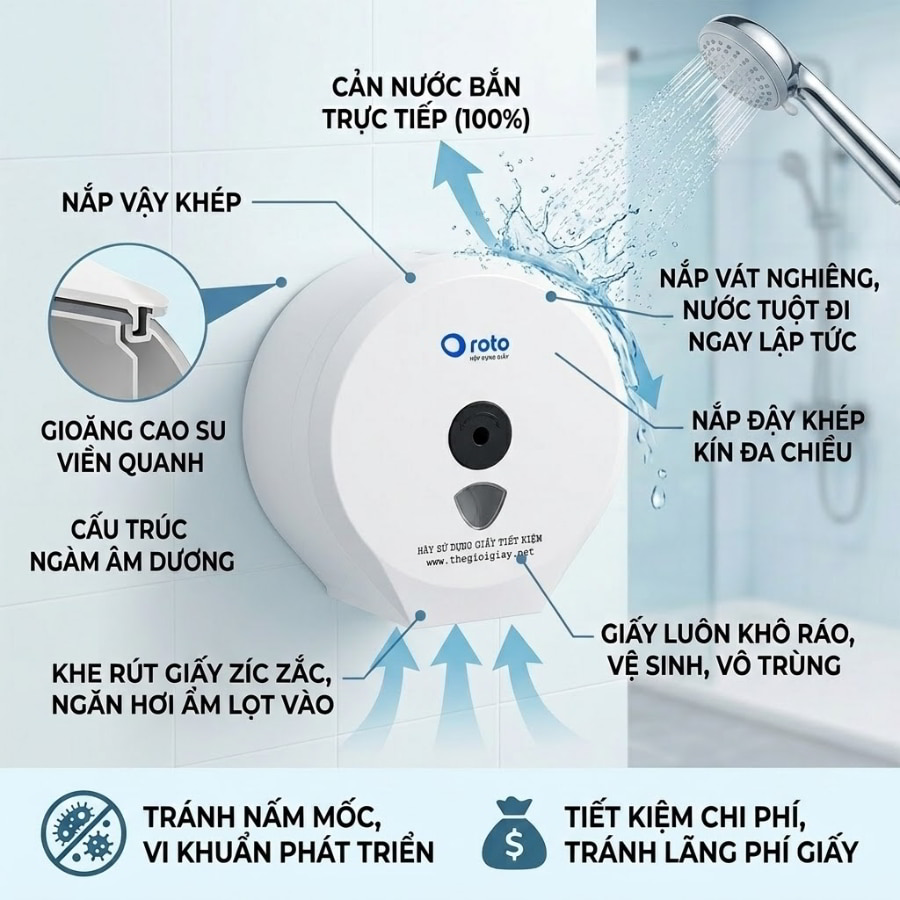 Đồng thời, nắp hộp được vát nghiêng tinh tế để nước tuột đi ngay lập tức, không đọng lại trên bề mặt. Phần khe rút giấy phía dưới cũng được thiết kế theo hình zíc zắc hoặc có viền cản nước siêu nhỏ. Điều này đảm bảo rằng hơi ẩm bốc lên từ sàn nhà không thể lọt ngược vào bên trong khu vực chứa lõi giấy. Nhờ cơ chế hoạt động khép kín toàn diện này, cuộn giấy vệ sinh của bạn sẽ luôn trong trạng thái khô ráo, thơm tho và vô trùng, sẵn sàng phục vụ bạn với chất lượng hoàn hảo nhất.