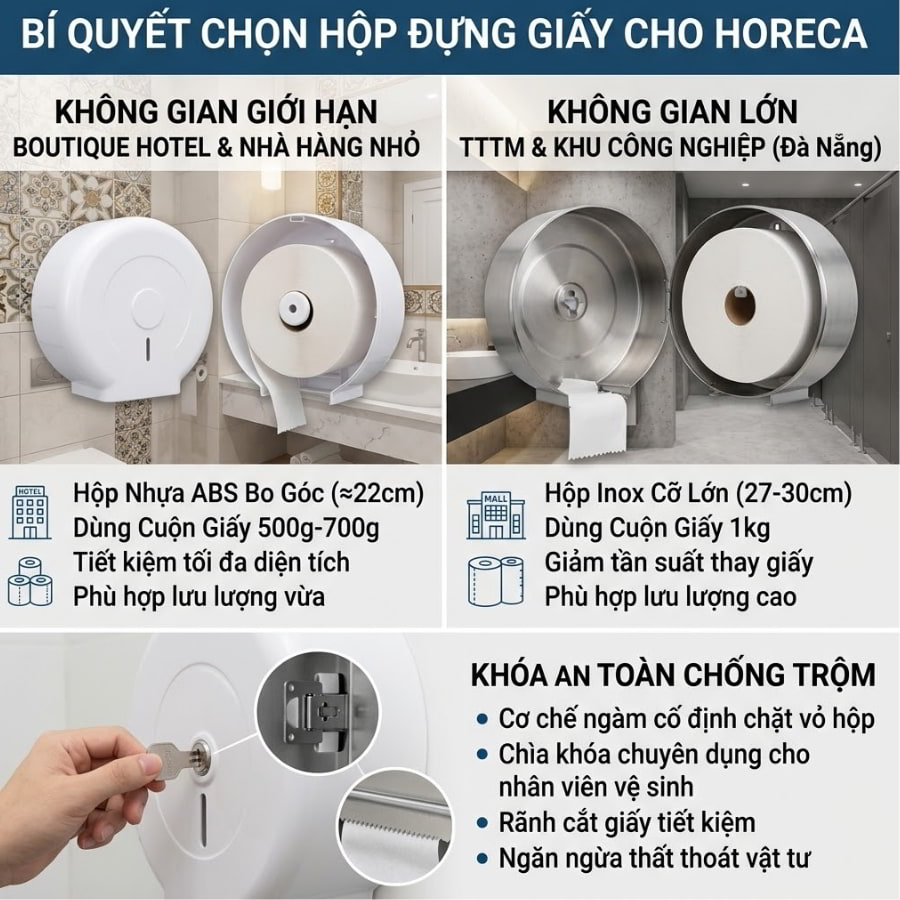 Đối với các khách sạn boutique hoặc nhà hàng có diện tích buồng vệ sinh giới hạn, những chiếc hộp bo góc tròn bằng nhựa ABS với đường kính khoảng 22cm (dùng cho cuộn 500g-700g) sẽ tiết kiệm diện tích tối đa. Ngược lại, tại các khu công nghiệp, trung tâm thương mại lớn ở Đà Nẵng, hộp inox cỡ lớn 27-30cm (dành cho cuộn 1kg) là lựa chọn hoàn hảo để giảm bớt áp lực thay giấy cho đội ngũ tạp vụ. Khám phá ngay các sản phẩm giấy công nghiệp tương thích hoàn hảo với hộp đựng kích thước chuẩn này.