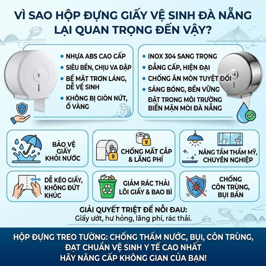Mặt khác, hộp đựng bằng Inox 304 lại mang đến vẻ đẹp đẳng cấp, sáng bóng và cực kỳ sang trọng. Inox 304 có khả năng chống ăn mòn tuyệt đối, không rỉ sét ngay cả trong môi trường biển mặn mòi của Đà Nẵng. Nhiều mẫu hộp treo tường hiện đại, bằng inox, nhựa ABS hoặc thép sơn tĩnh điện… phù hợp với mọi phong cách nội thất. Những hộp đựng này có khả năng chống thấm nước, chống bụi, chống côn trùng xâm nhập vào bề mặt giấy, đảm bảo cuộn giấy bên trong luôn khô ráo và đạt chuẩn vệ sinh y tế cao nhất.