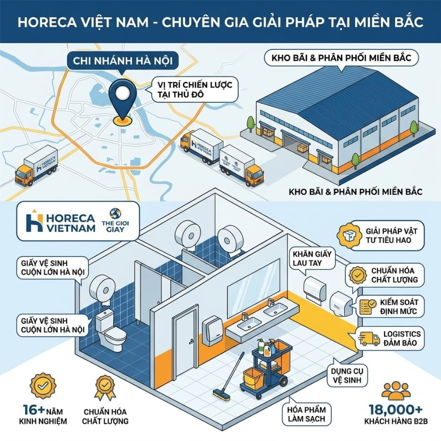 Nằm ở vị trí chiến lược tại thủ đô, Horeca Việt Nam chi nhánh Hà Nội là cánh tay nối dài mạnh mẽ của Thế Giới Giấy – đơn vị đã có hơn 16 năm kinh nghiệm, phục vụ hơn 18.000 khách hàng doanh nghiệp trên toàn quốc. Sự hiện diện của kho bãi và trung tâm phân phối tại Hà Nội giúp chúng tôi giải quyết triệt để bài toán logistics, đảm bảo hàng hóa luôn sẵn sàng để phục vụ khách hàng B2B khu vực miền Bắc.