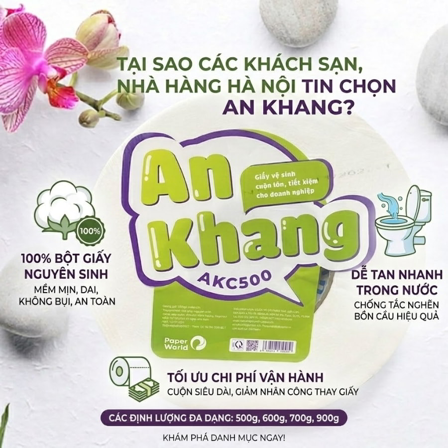 - Chất liệu thuần khiết: Giấy vệ sinh An Khang được làm từ 100% bột giấy nguyên sinh, đảm bảo mềm mịn, dai, thấm hút tốt, không bụi và an toàn tuyệt đối cho người sử dụng.