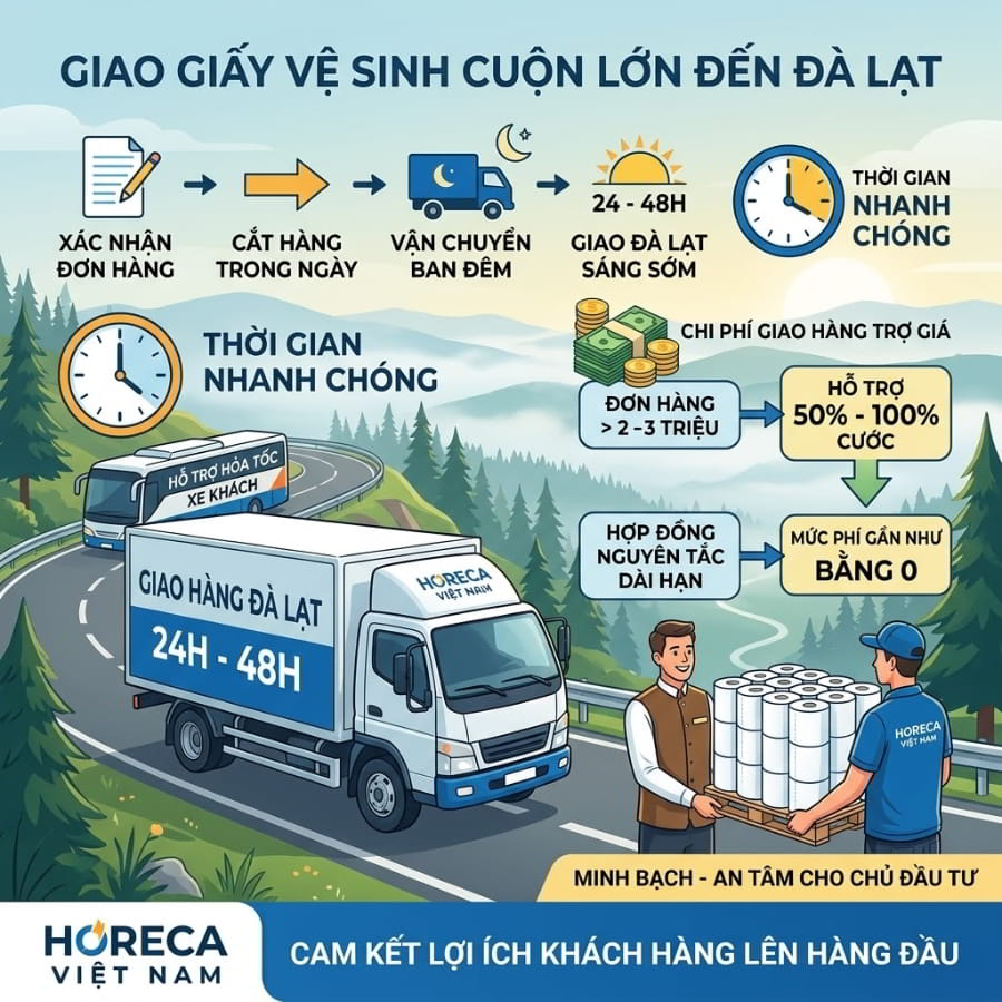 Thay vì mập mờ về phí ship, Horeca Việt Nam áp dụng chính sách trợ giá cước cực kỳ hấp dẫn. Với các đơn hàng đạt giá trị tối thiểu (thường từ 2-3 triệu đồng trở lên), chúng tôi sẽ hỗ trợ từ 50% đến 100% cước phí vận chuyển từ TP.HCM đến tận chành xe hoặc tận cửa khách sạn tại Đà Lạt. Đối với các đối tác ký hợp đồng nguyên tắc dài hạn, mức phí này gần như bằng 0. Chúng tôi hiểu rằng việc tối ưu một vài ngàn đồng trên mỗi cuộn giấy sẽ là con số khổng lồ khi nhân với quy mô hàng năm của doanh nghiệp.