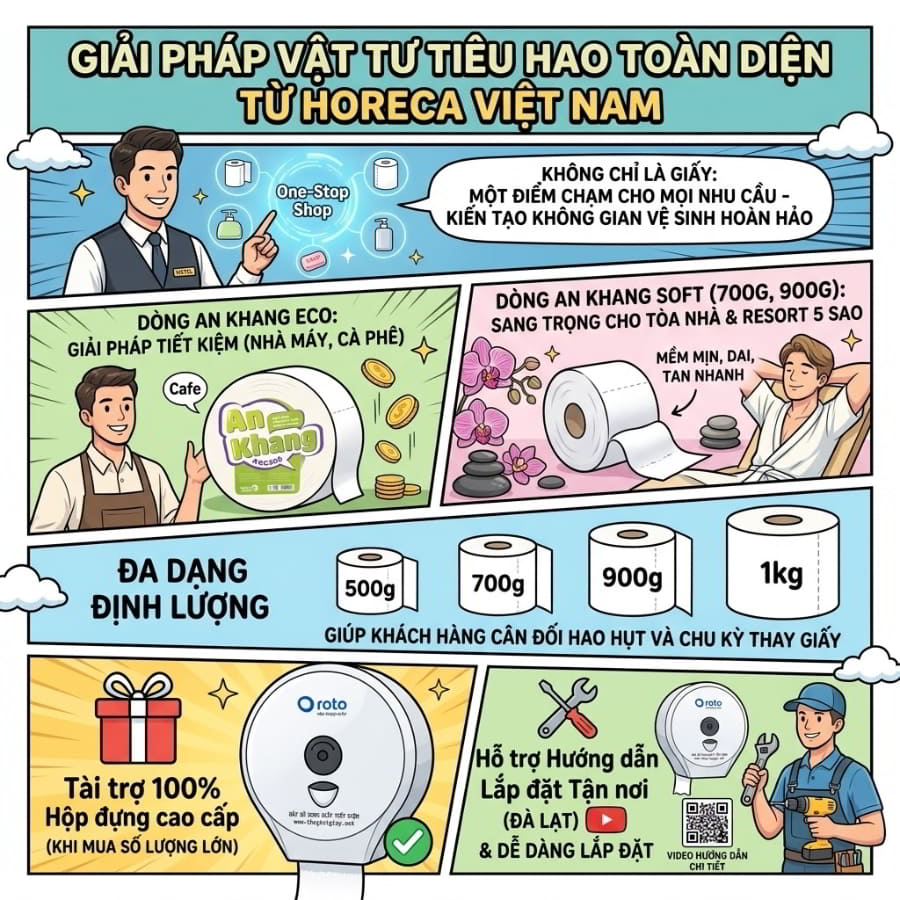 Horeca Việt Nam không chỉ bán giấy vệ sinh. Chúng tôi định vị mình là nhà kiến tạo không gian vệ sinh hoàn hảo. Bằng việc cung cấp một dải sản phẩm đồng bộ, chúng tôi giúp các khách sạn tại Đà Lạt quản lý nguồn cung dễ dàng hơn, chỉ cần “một điểm chạm” là giải quyết được mọi nhu cầu về danh mục giấy vệ sinh