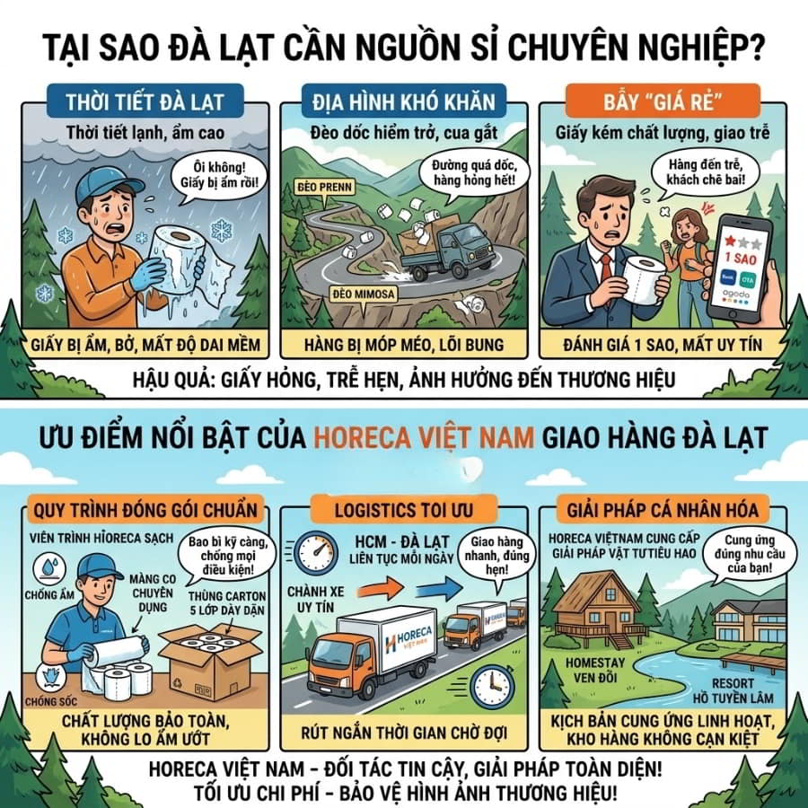 Hãy tưởng tượng bạn là quản lý của một khách sạn 4 sao tại trung tâm Đà Lạt vào đúng dịp lễ ngàn hoa. Lượng khách lưu trú đạt 100% công suất. Đột nhiên, bộ phận buồng phòng báo cáo: “Chúng ta sắp hết sạch giấy vệ sinh cuộn lớn!”. Bạn gọi ngay cho đại lý cũ, nhưng họ báo giá vận chuyển cắt cổ và phải chờ 3 ngày hàng mới từ TP.HCM lên tới nơi. Đó chính là cơn ác mộng Logistics mà bất kỳ người làm dịch vụ nhà hàng, khách sạn (HORECA) nào cũng từng trải qua. Hiểu được “nỗi đau” về khoảng cách địa lý, thời tiết sương mù làm ẩm mốc giấy, và chi phí đội lên cao, dịch vụ Horeca Việt Nam giao hàng Đà Lạt đã ra đời như một vị cứu tinh. Chúng tôi không chỉ cung cấp sản phẩm, chúng tôi mang đến một hệ sinh thái vật tư ổn định, xóa bỏ mọi rào cản về không gian và thời gian cho doanh nghiệp của bạn.