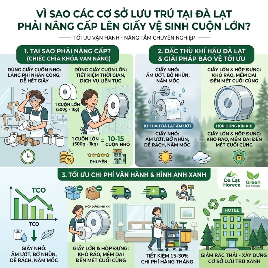 Chưa dừng lại ở đó, giá trị tiết kiệm lớn nhất nằm ở quỹ thời gian của nhân sự. Một cuộn giấy 700g có thể dùng từ 3-5 ngày cho 20-30 người/ngày trong môi trường văn phòng hay sảnh khách sạn. Nhờ vậy, nhân viên buồng phòng không cần tốn quá nhiều thời gian cho việc bổ sung giấy liên tục, từ đó họ có thể tập trung nâng cao chất lượng làm sạch phòng hoặc chăm sóc khách hàng. Việc giảm thiểu rác thải từ bao bì nilon và lõi giấy cũng giúp doanh nghiệp cắt giảm chi phí thu gom rác, đồng thời xây dựng thành công hình ảnh một cơ sở lưu trú xanh, thân thiện với môi trường sinh thái tuyệt đẹp của Đà Lạt.