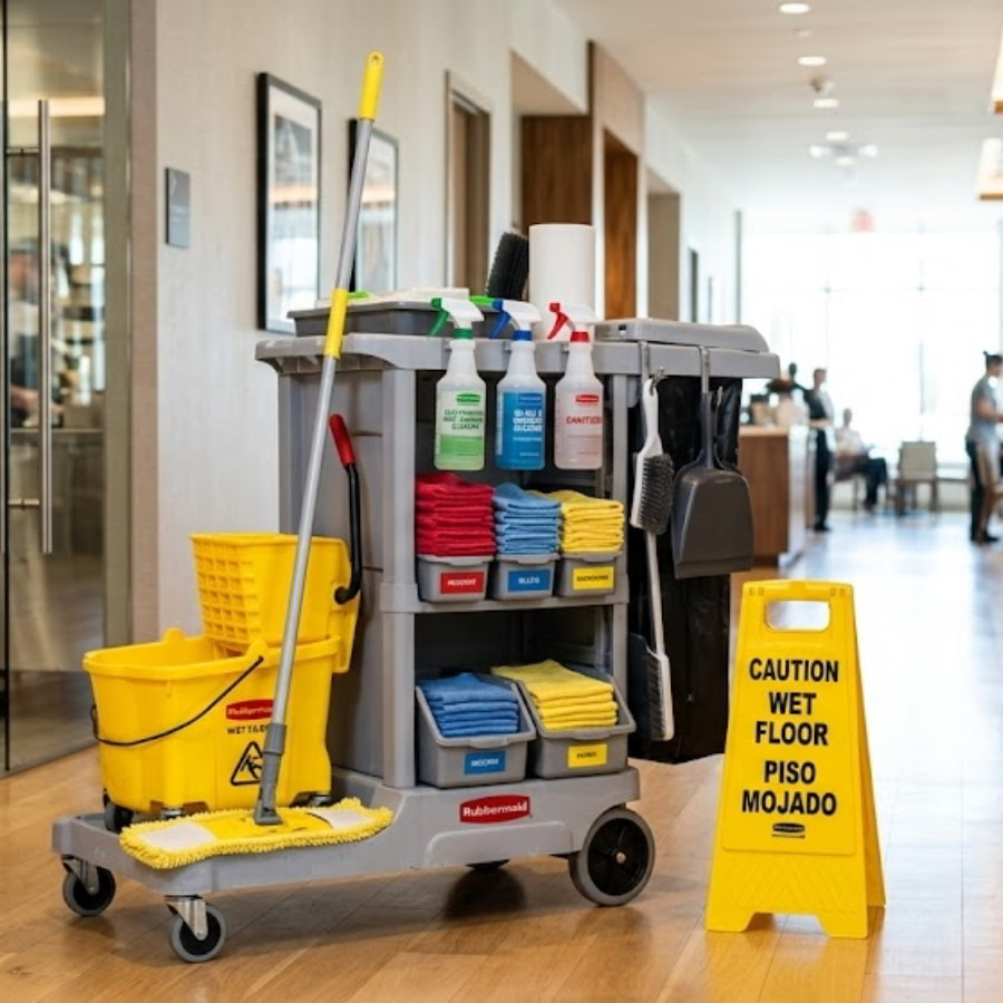 Sự chuẩn bị kỹ lưỡng quyết định 50% thành công của công việc dọn dẹp. Để đảm bảo nhân viên tạp vụ (housekeeping) có thể thực hiện quy trình một cách nhanh chóng và triệt để, quản lý nhà hàng cần trang bị đầy đủ xe đẩy vệ sinh chuyên dụng. Đầu tiên, hóa chất là yếu tố bắt buộc: dung dịch tẩy rửa bồn cầu, nước lau kính, dung dịch lau sàn và sáp thơm khử mùi. Tuyệt đối không dùng chung một loại hóa chất cho mọi bề mặt để tránh làm hỏng men sứ hoặc inox.