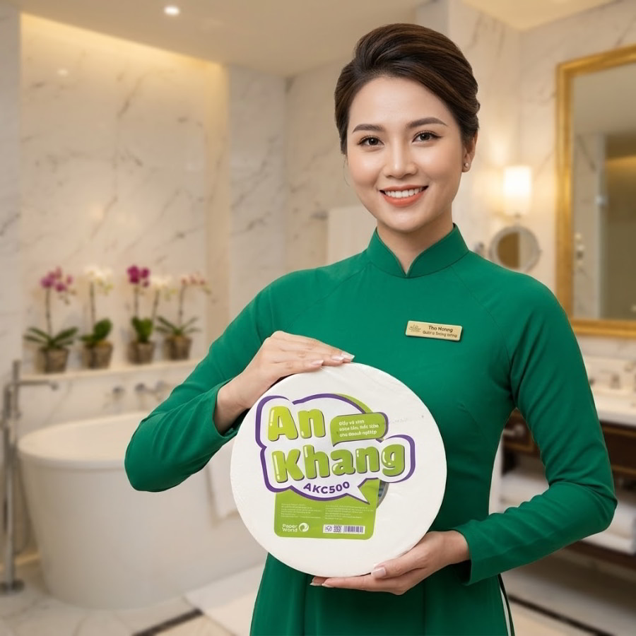 Giữa hàng trăm thương hiệu, giấy vệ sinh cuộn lớn An Khang luôn là lựa chọn hàng đầu của hơn 18.000 doanh nghiệp. Với trọng lượng 700g, đây là sự cân bằng lý tưởng cho nhà hàng: lượng giấy đủ nhiều để phục vụ lưu lượng khách đông, nhưng kích thước không quá cồng kềnh. Giấy An Khang được sản xuất từ 100% bột giấy nguyên sinh, đảm bảo độ trắng mịn, dai, và tuyệt đối không gây kích ứng da. Điểm mấu chốt là loại giấy này cực kỳ dễ tan trong nước, giúp hệ thống nhà hàng tránh được thảm họa tắc nghẽn đường ống thoát nước. Đặc biệt, khi mua sỉ, các nhà hàng thường được Thế Giới Giấy tài trợ miễn phí hộp đựng chuyên dụng bằng nhựa ABS hoặc inox, nâng tầm hình ảnh sang trọng ngay lập tức.